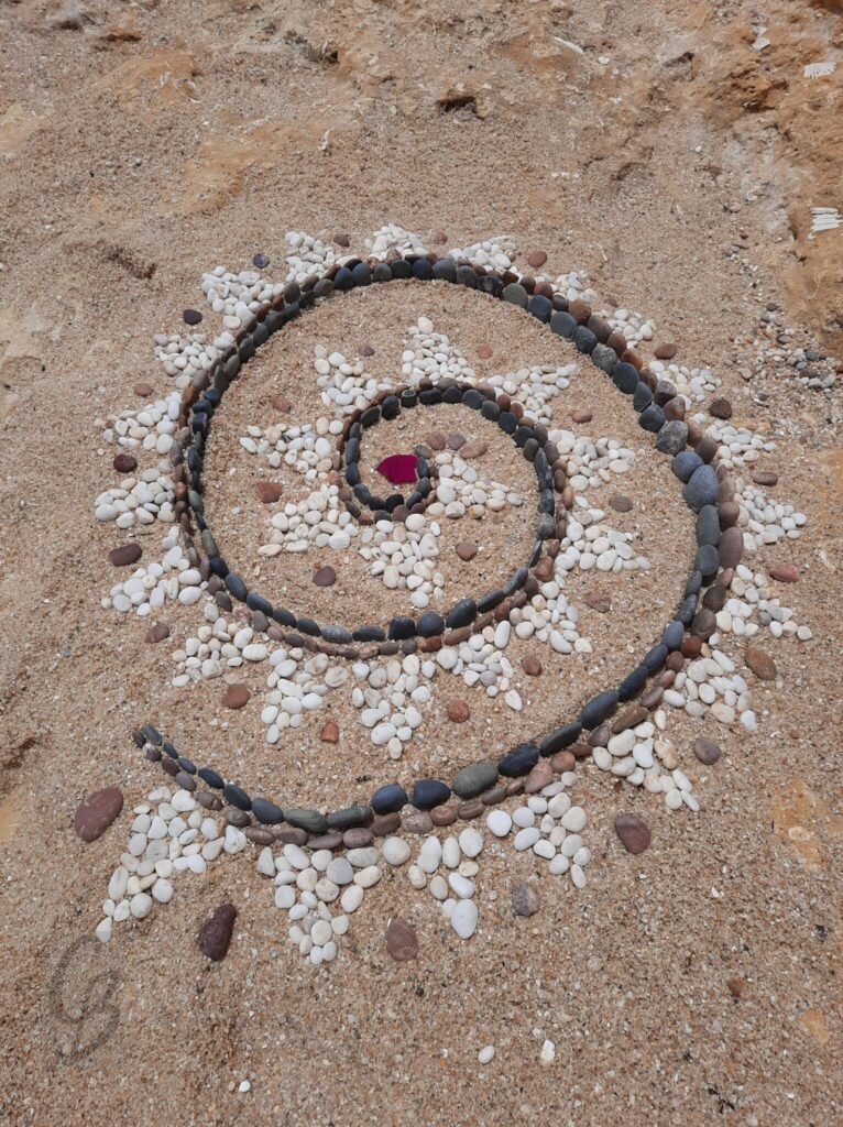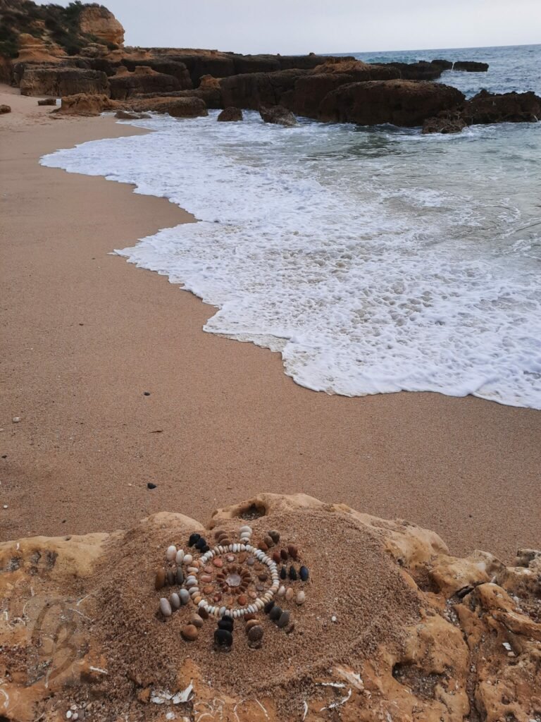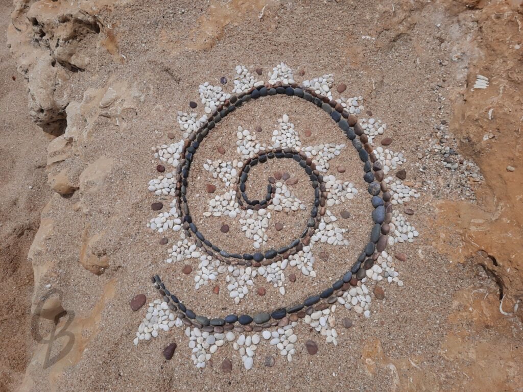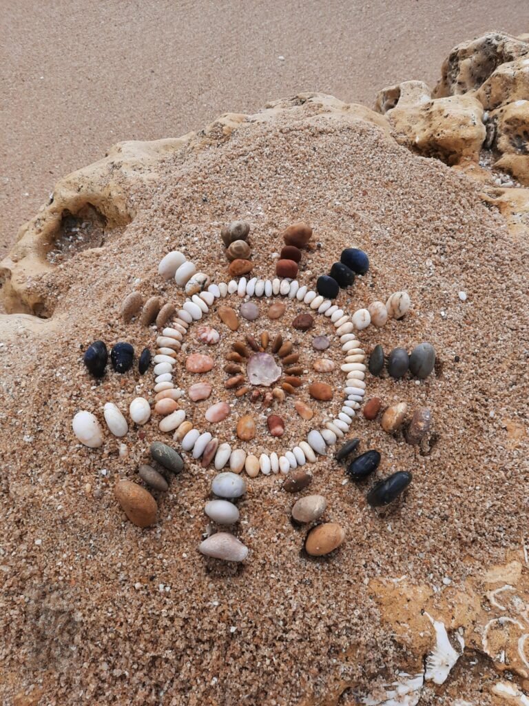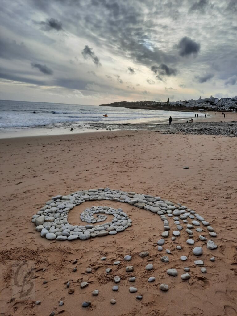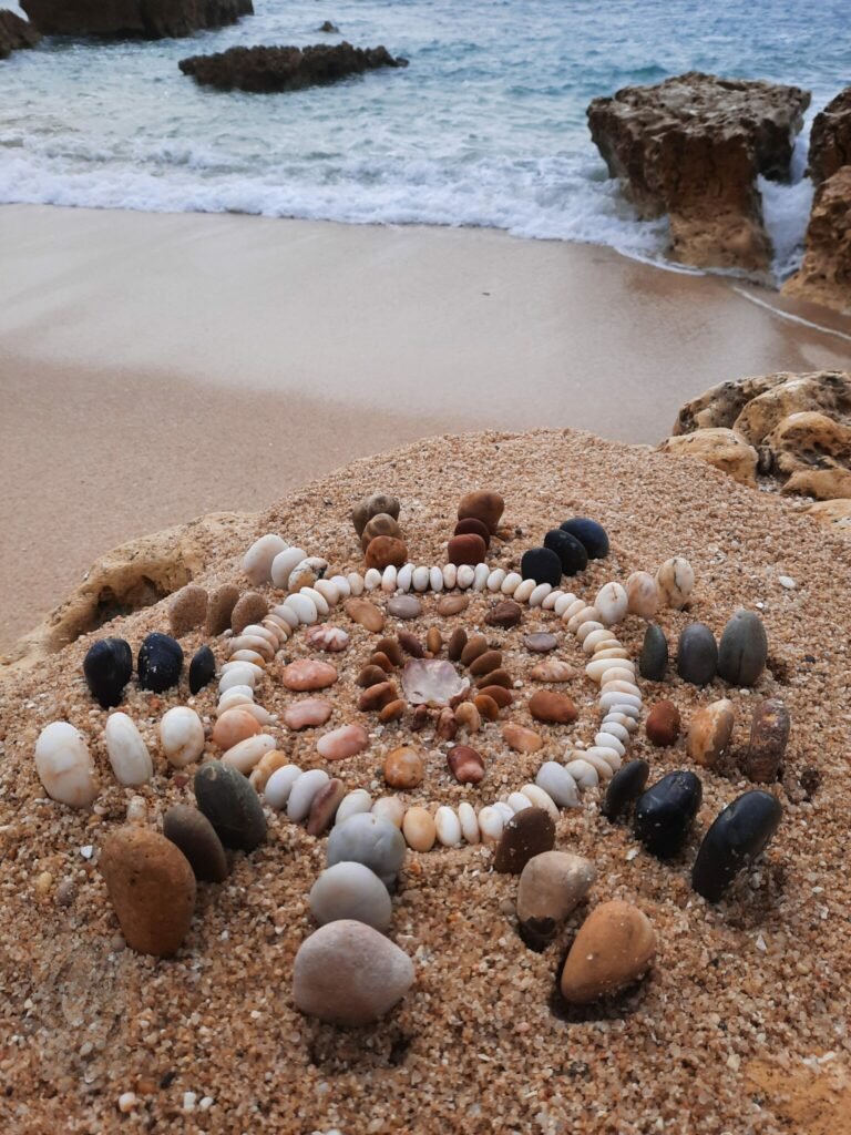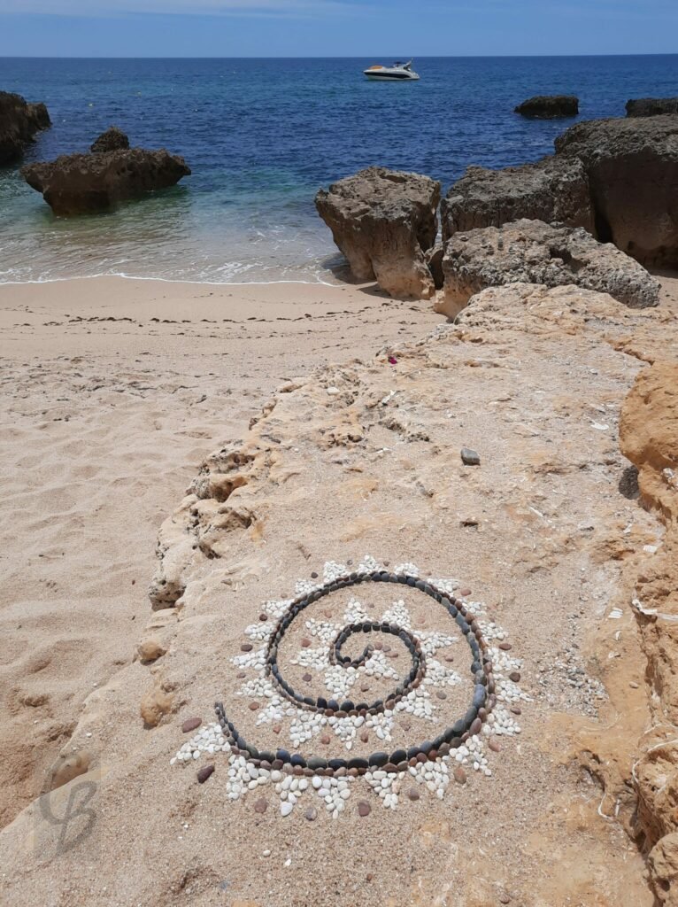 An den Stränden der Algarve liegt das Material zum Bilder „malen“ im Sand. Die Idee sehe ich in den Steinen. An der Westküste Portugals in Monte Clerigo finde ich bei Ebbe die schwarzen Steine mit dem weißen Einschuss, damit lässt es sich leicht zeichnen. Die bunte Farbvielfalt an nur einem Strand beeindruckt und inspiriert mich zu vielen Werken.