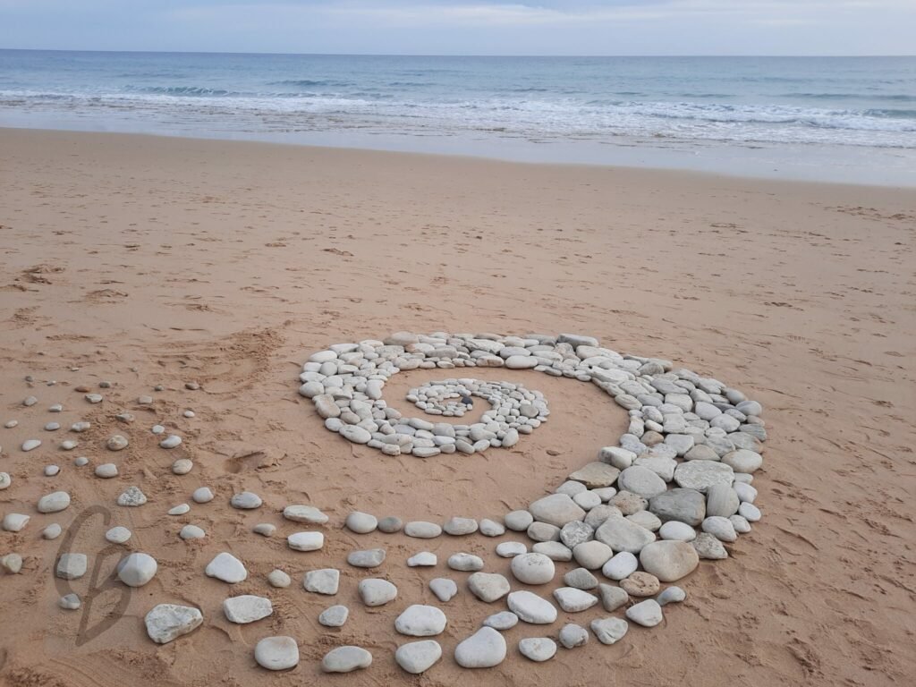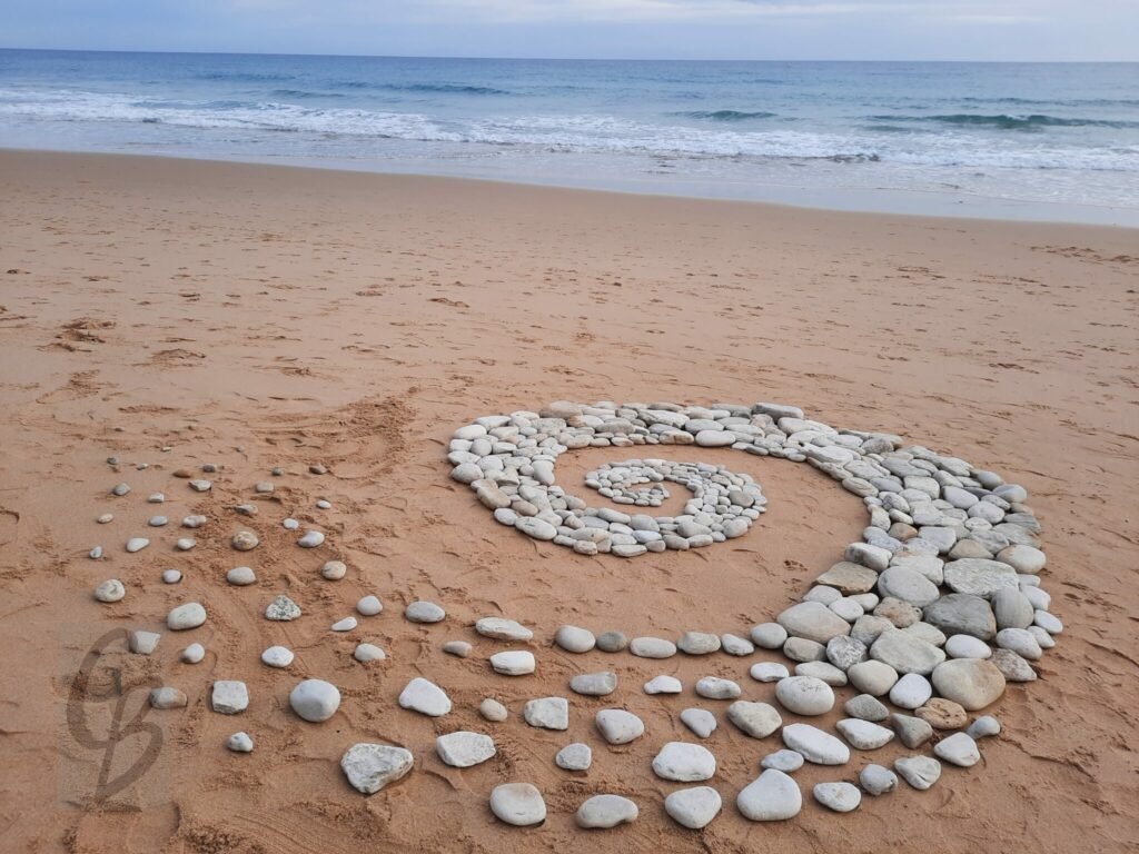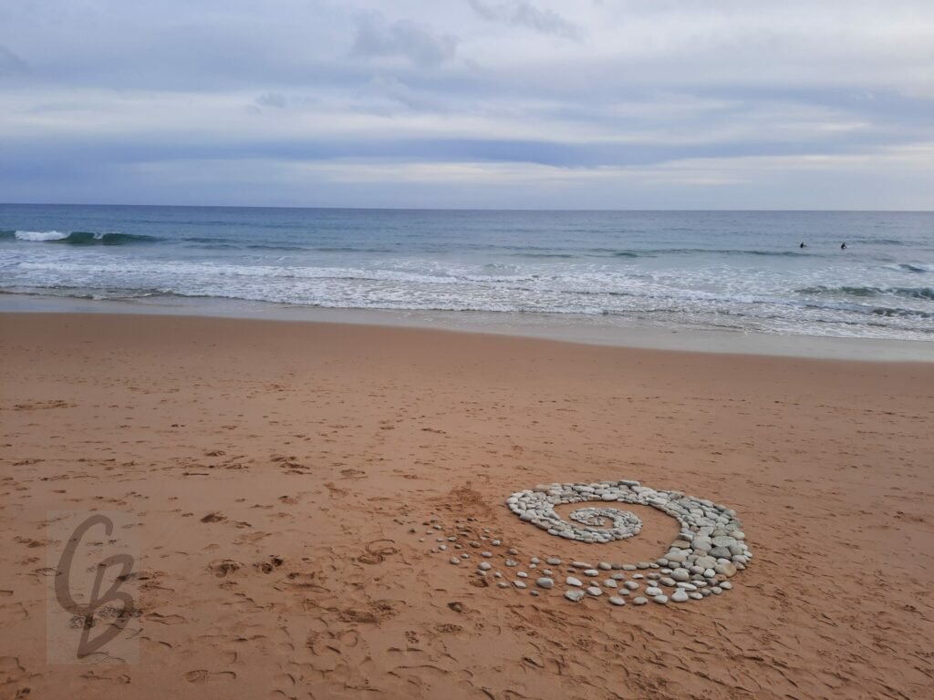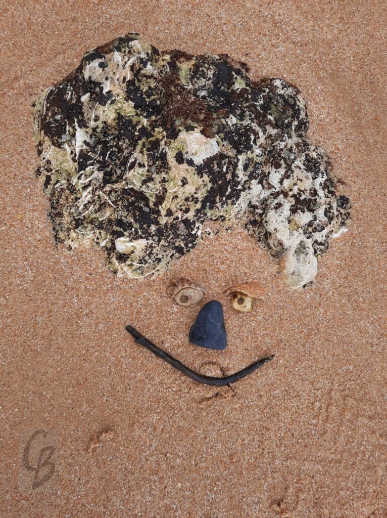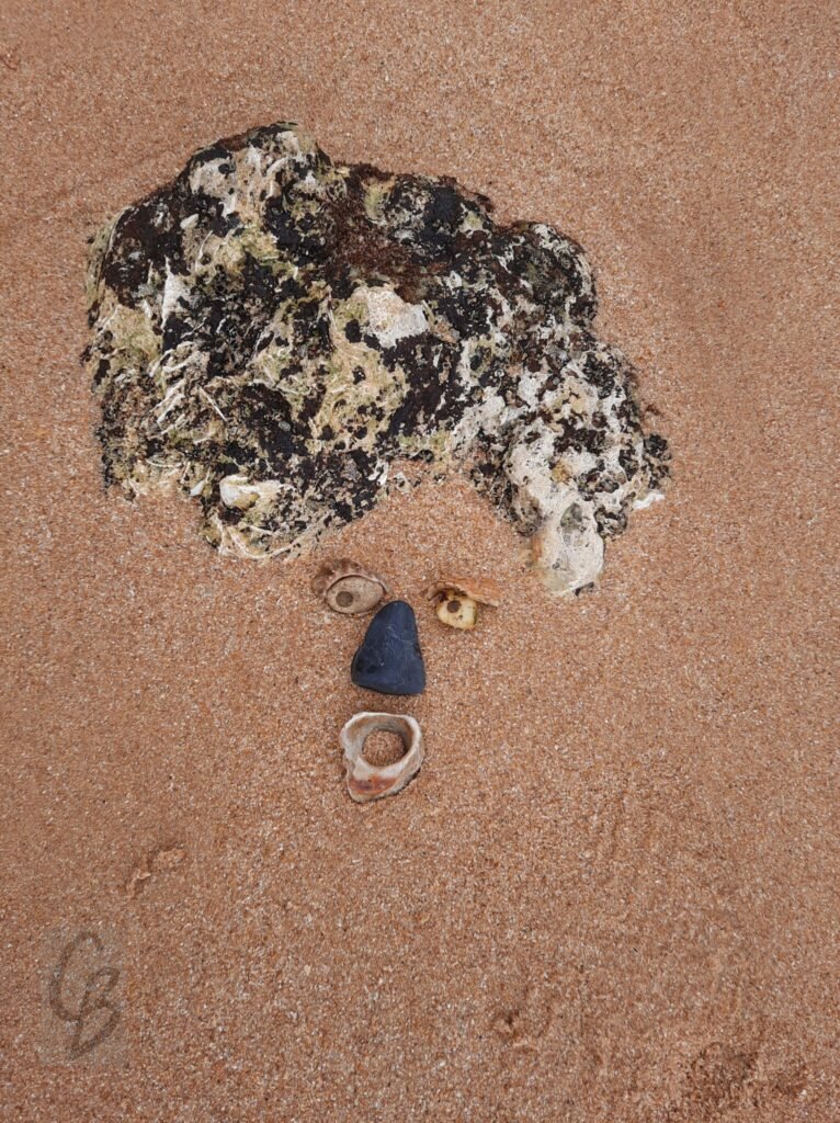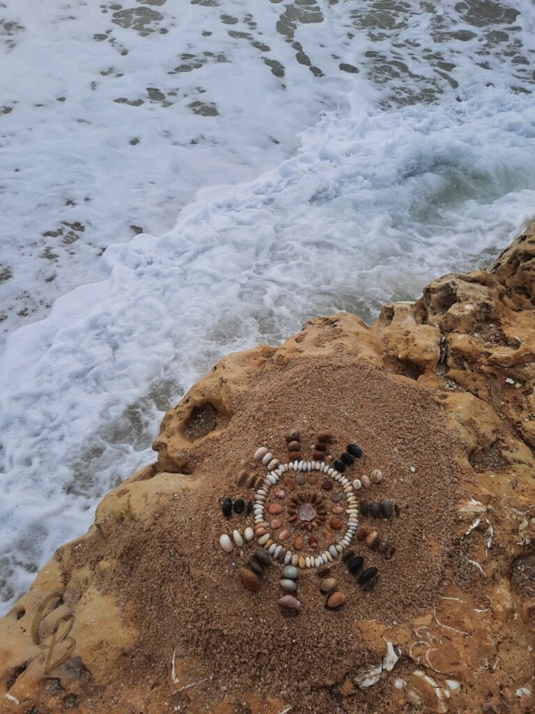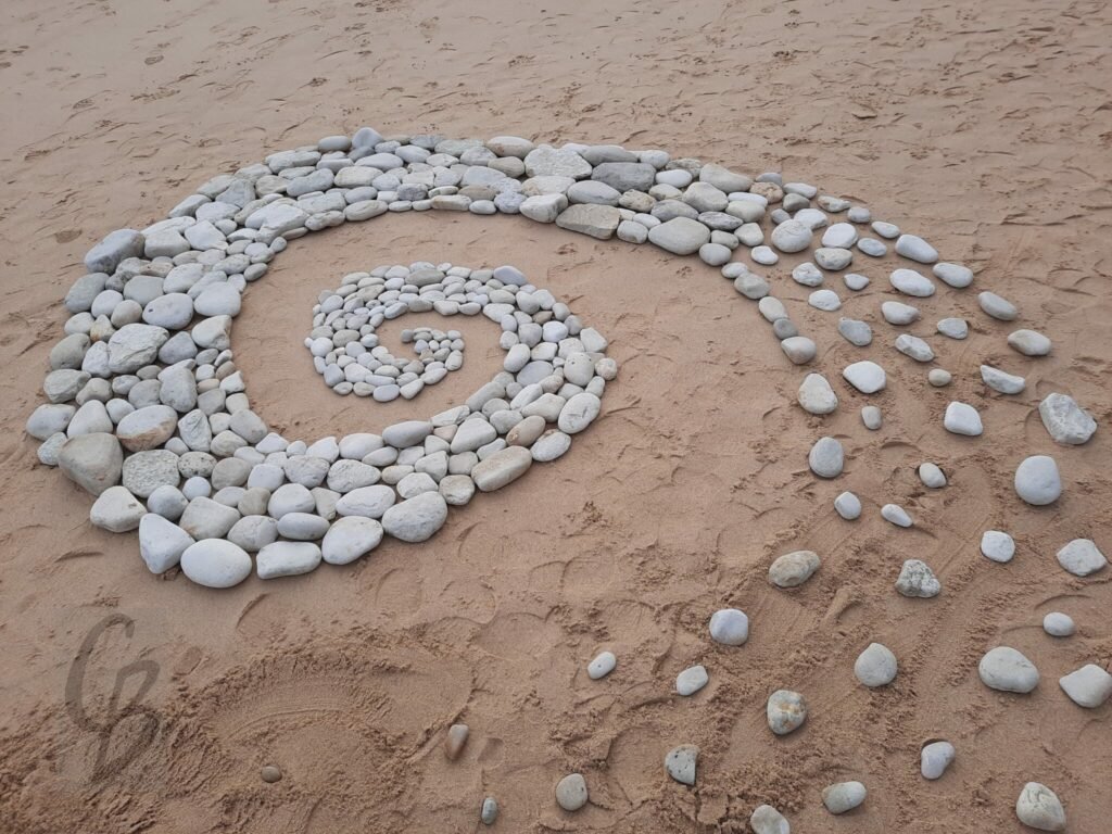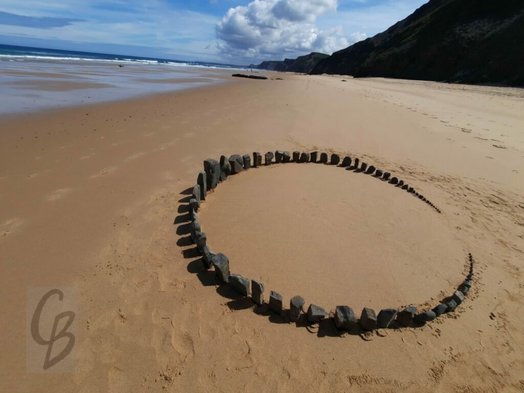 An den Stränden der Algarve liegt das Material zum Bilder „malen“ im Sand. Die Idee sehe ich in den Steinen. An der Westküste Portugals in Monte Clerigo finde ich bei Ebbe die schwarzen Steine mit dem weißen Einschuss, damit lässt es sich leicht zeichnen. Die bunte Farbvielfalt an nur einem Strand beeindruckt und inspiriert mich zu vielen Werken.