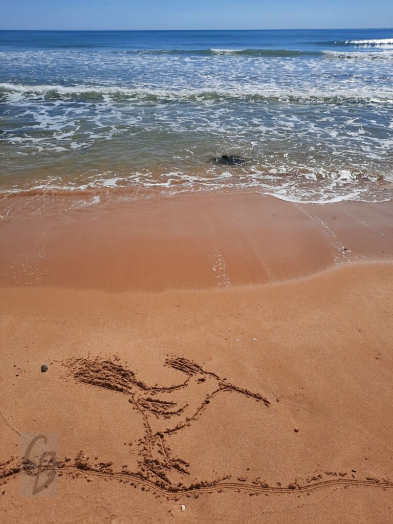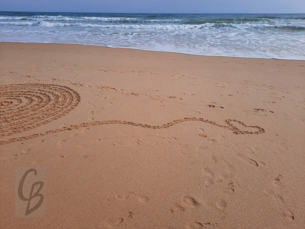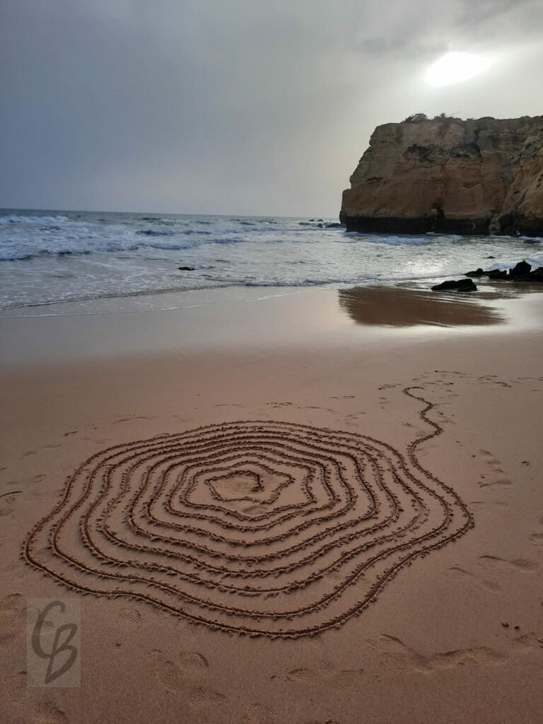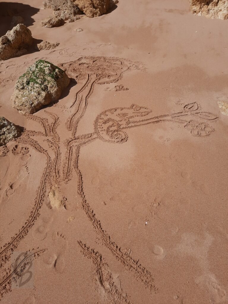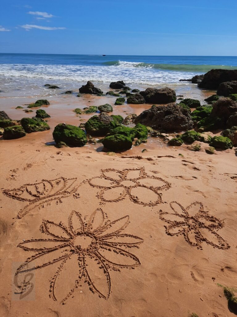 Mit einem Garten-Rechen kann ich bei Ebbe wunderbar auf riesiger „Leinwand“ malen.