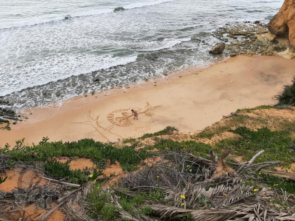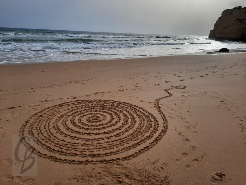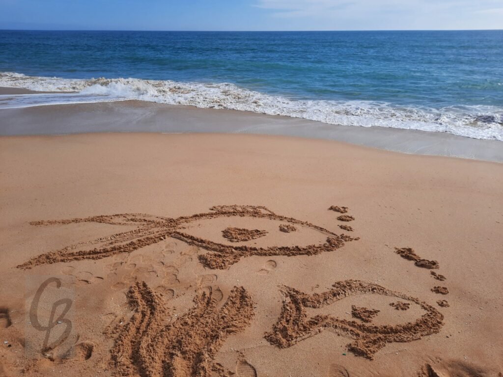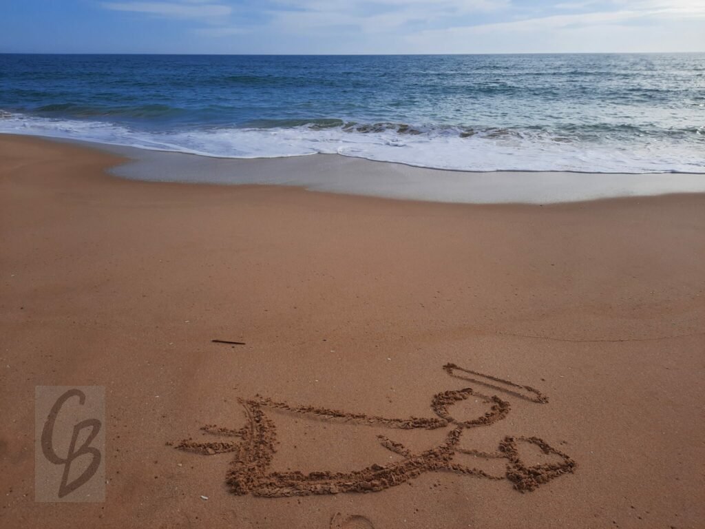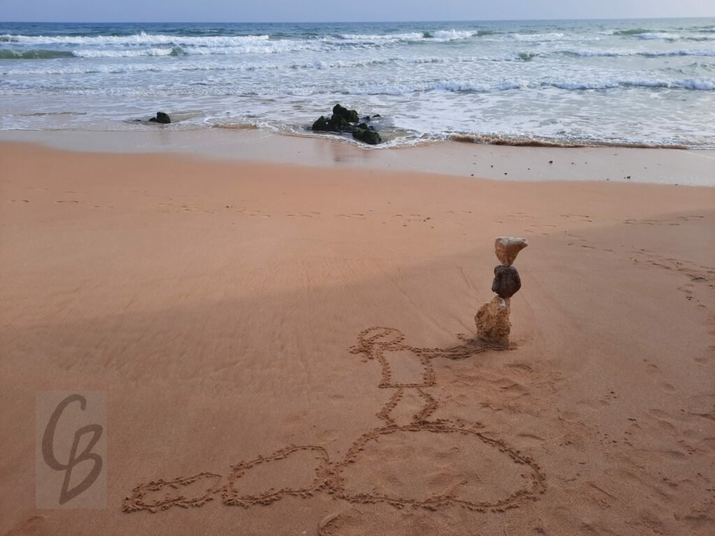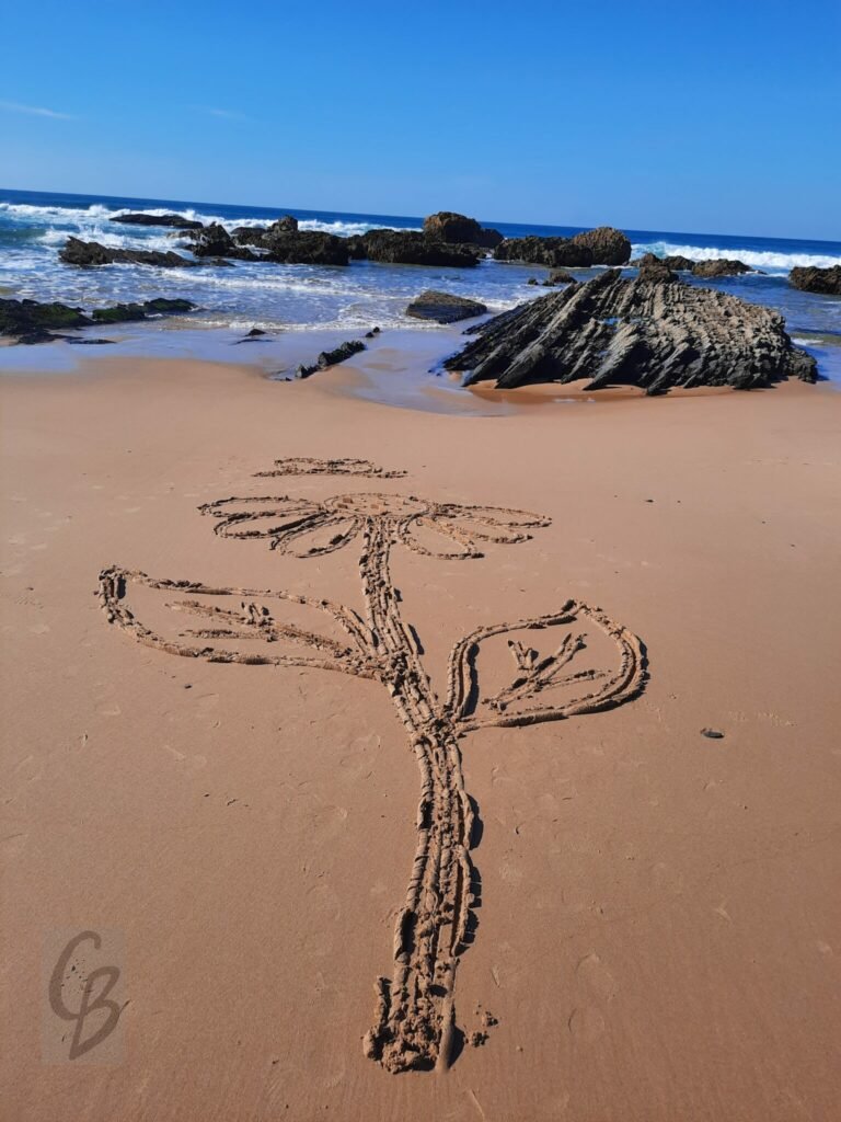 Mit einem Garten-Rechen kann ich bei Ebbe wunderbar auf riesiger „Leinwand“ malen.
