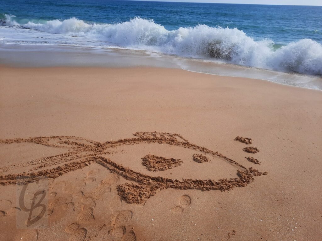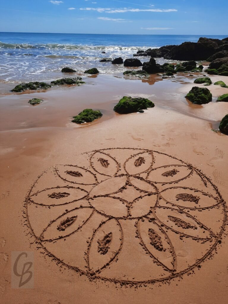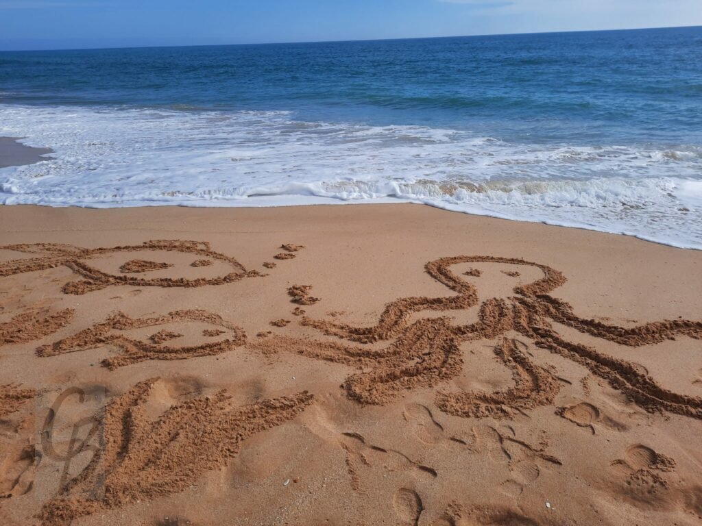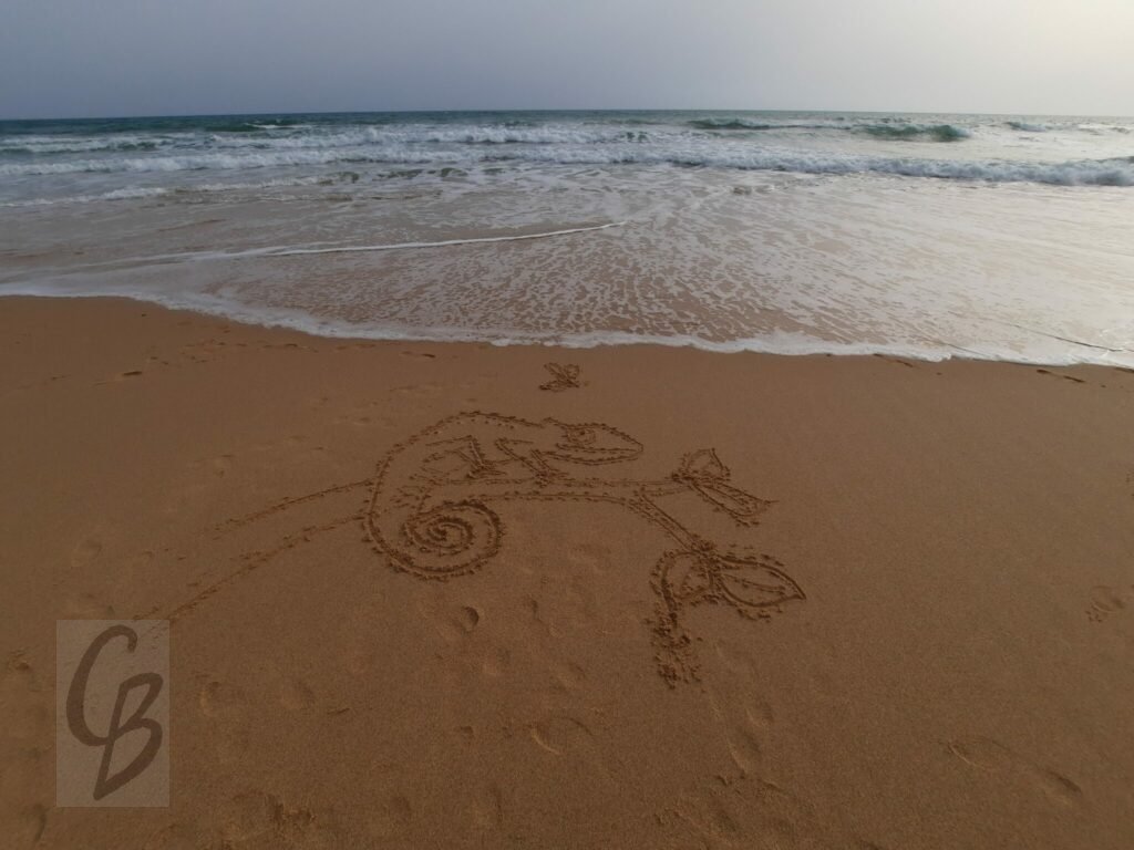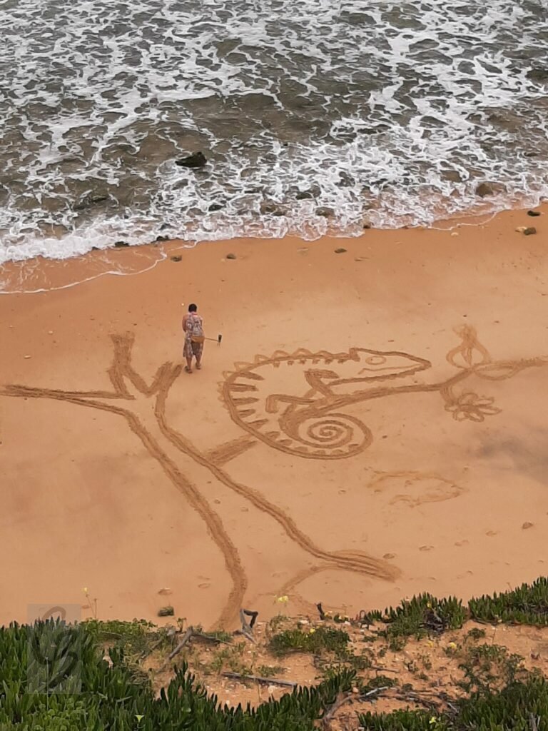 Mit einem Garten-Rechen kann ich bei Ebbe wunderbar auf riesiger „Leinwand“ malen.