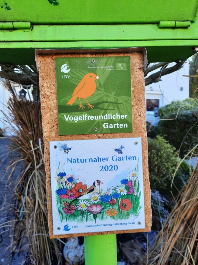 Bei dem Pilotprojekt „Vogelfreundlicher Garten“ Sommer 2021 vom Landesbund für Vogelschutz LBV wurde mein kleiner Reihenhausgarten mit der Plakette Vogelfreundlicher Garten ausgezeichnet.