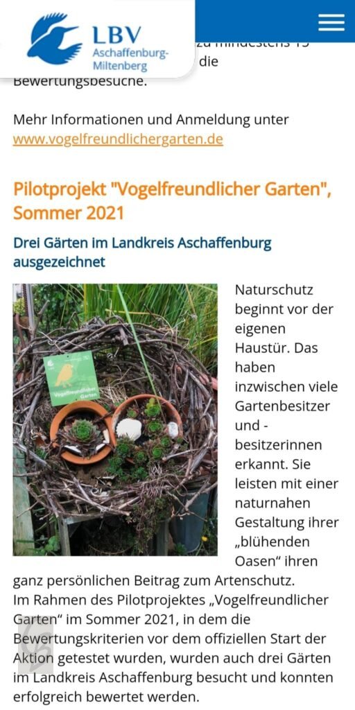 Im Main-Echo vom 17.12.2021 wurde über die Prämierung des Pilotprojekt „Vogelfreundlicher Garten“ berichtet und zur bayernweite Kampagne vom Landesbund für Vogelschutz LBV und Landesamt für Umwelt LfU für nächstes Jahr aufgerufen.