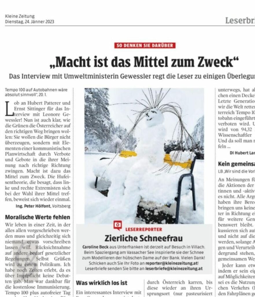 während dem Besuch bei der Familie in Österreich modellierte ich einige Schneedamen, mit dieser kam ich dort als Leserreporter in die „kleine Zeitung“.