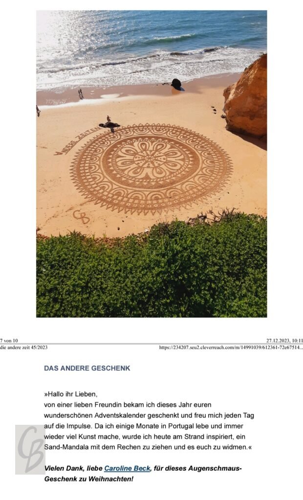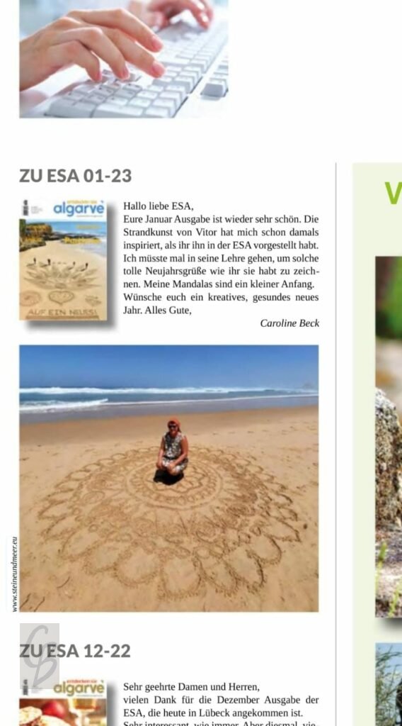 In der Februar Ausgabe 2023 von „Entdecken Sie Algarve“ bin ich mit meinem Strand Mandala bei den Leserbriefen zu sehen.