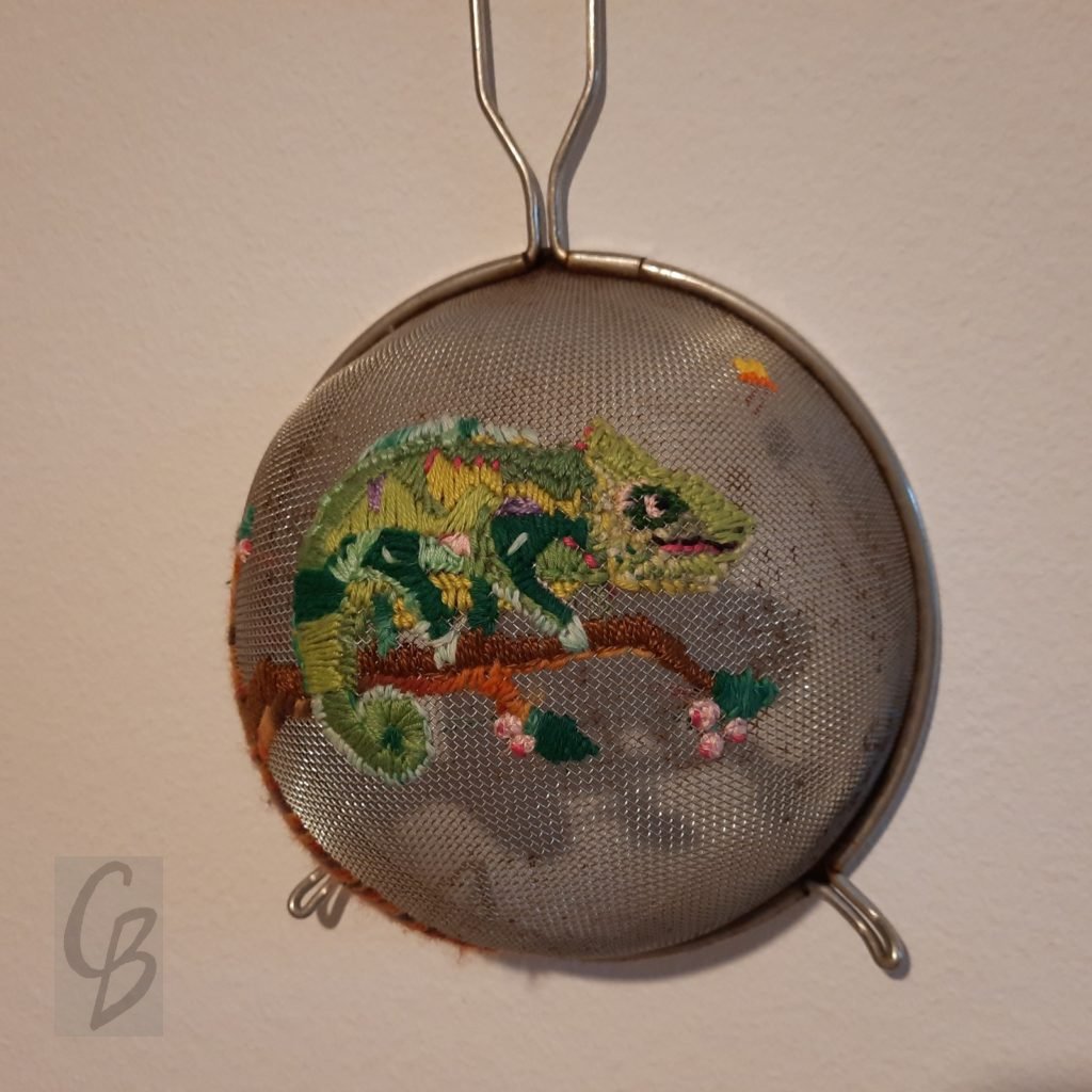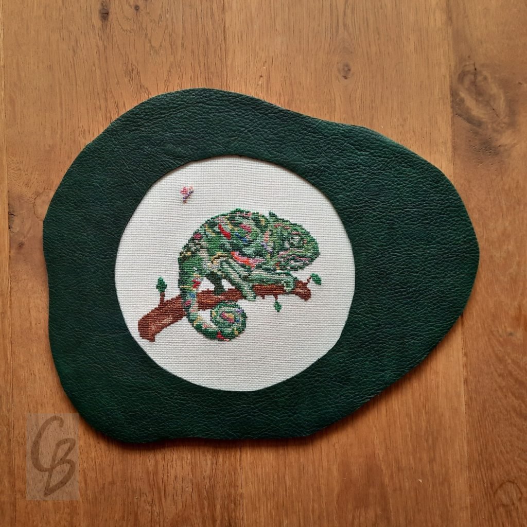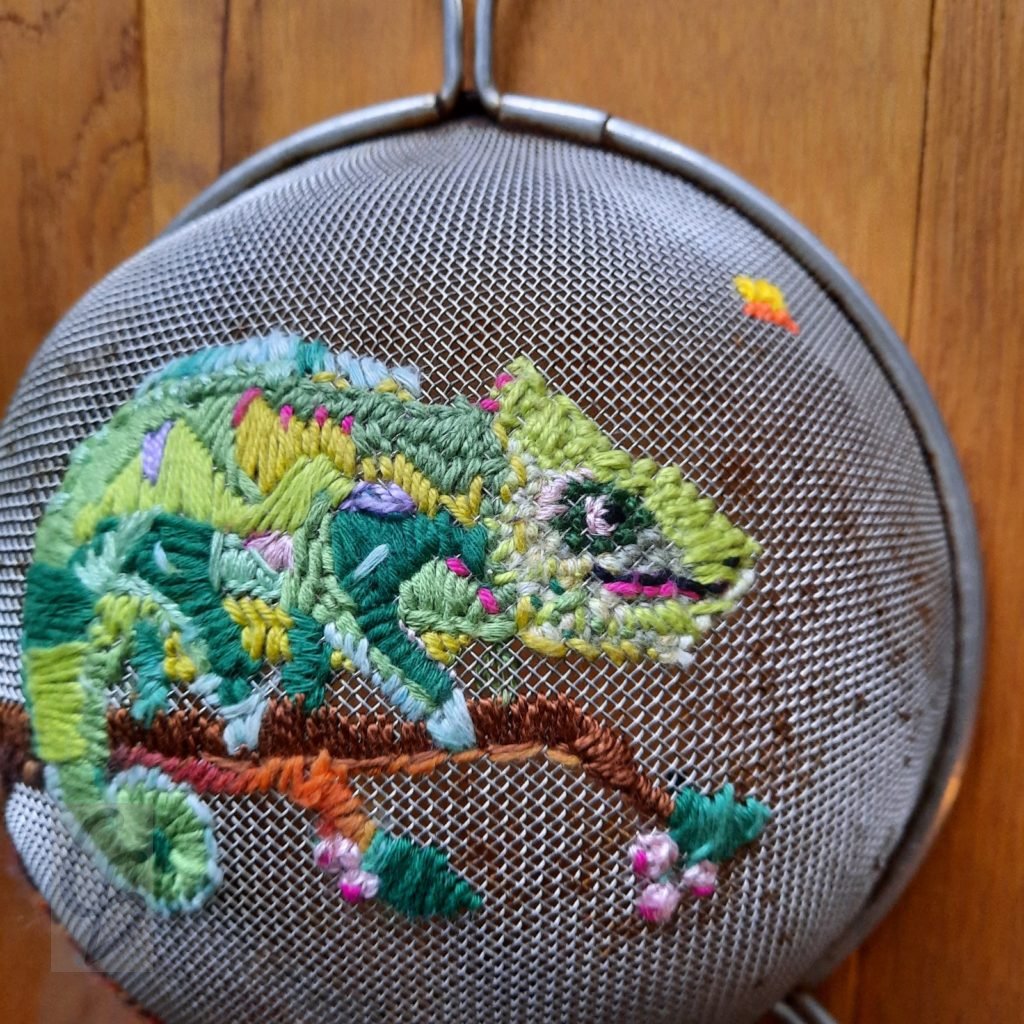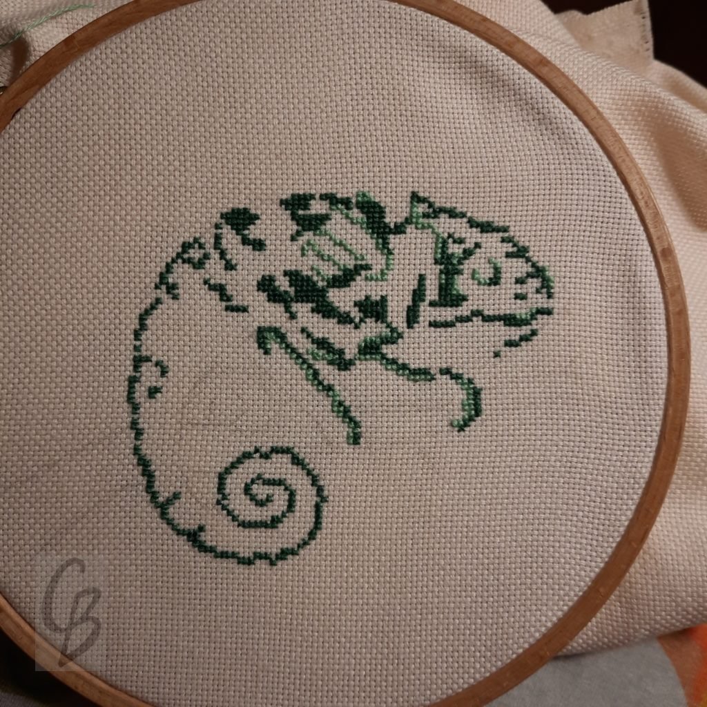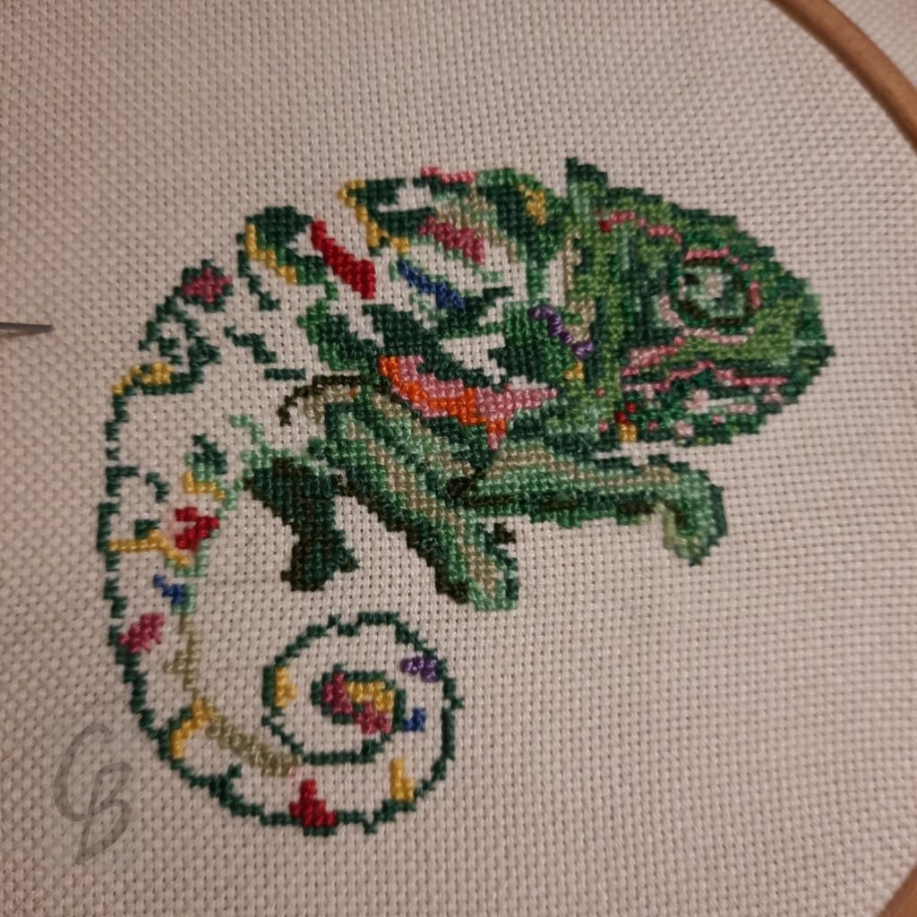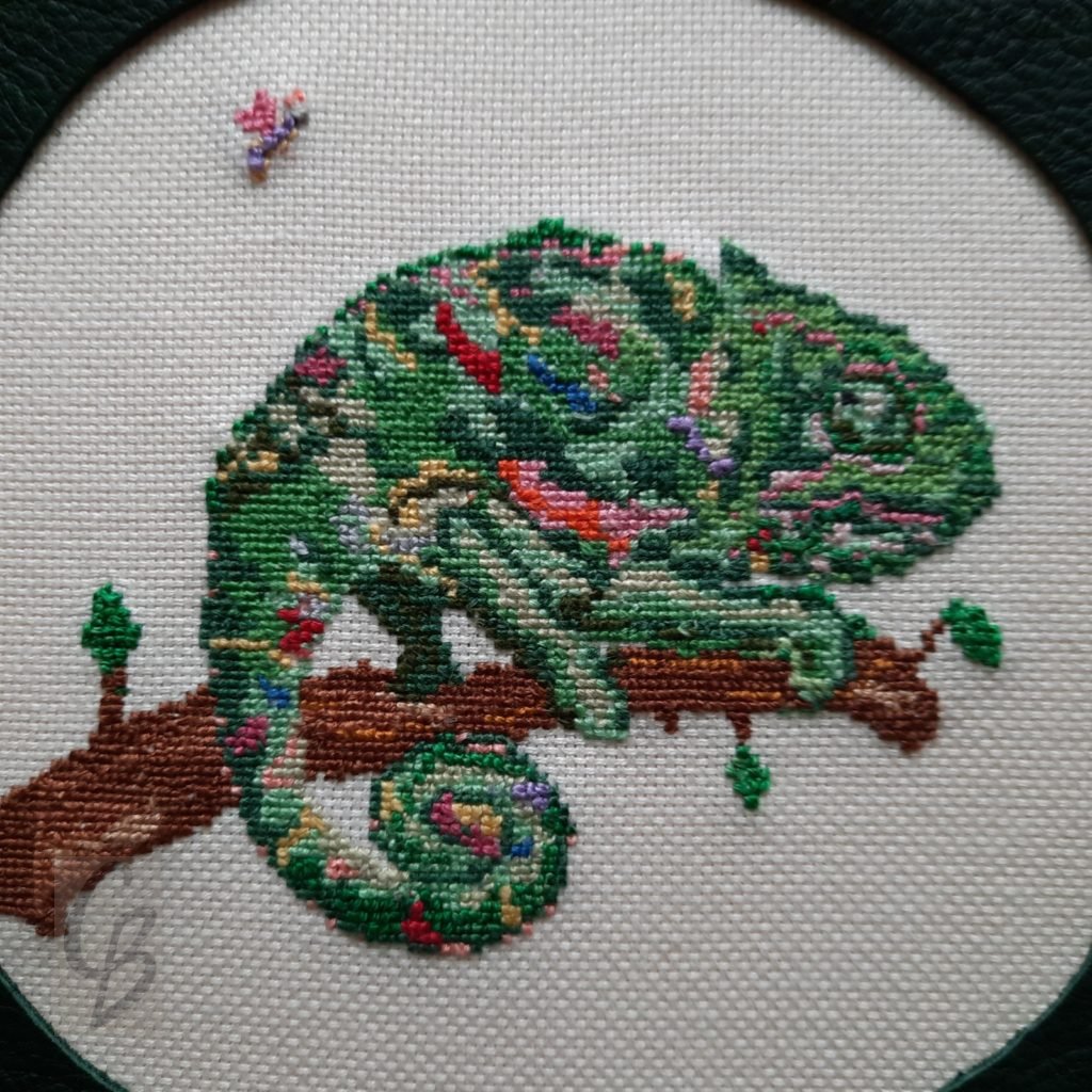 aus feinen Kreuzstichen wächst ein Chamäleon