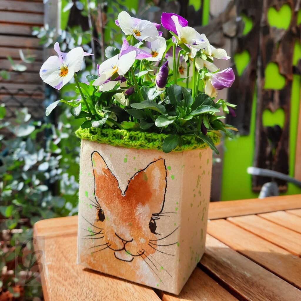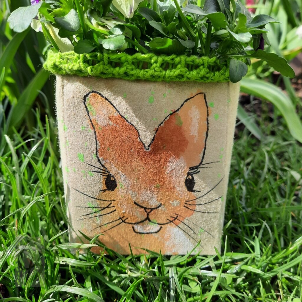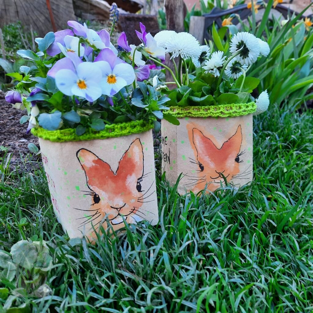 Vom Tetrapack die Folie abgezogen und einen Langohr darauf gemalt, den oberen Rand umhäkelt und Blümchen eingepflanzt, ideales Ostergeschenk 😉
