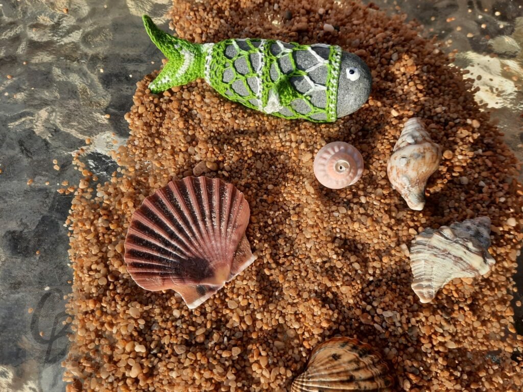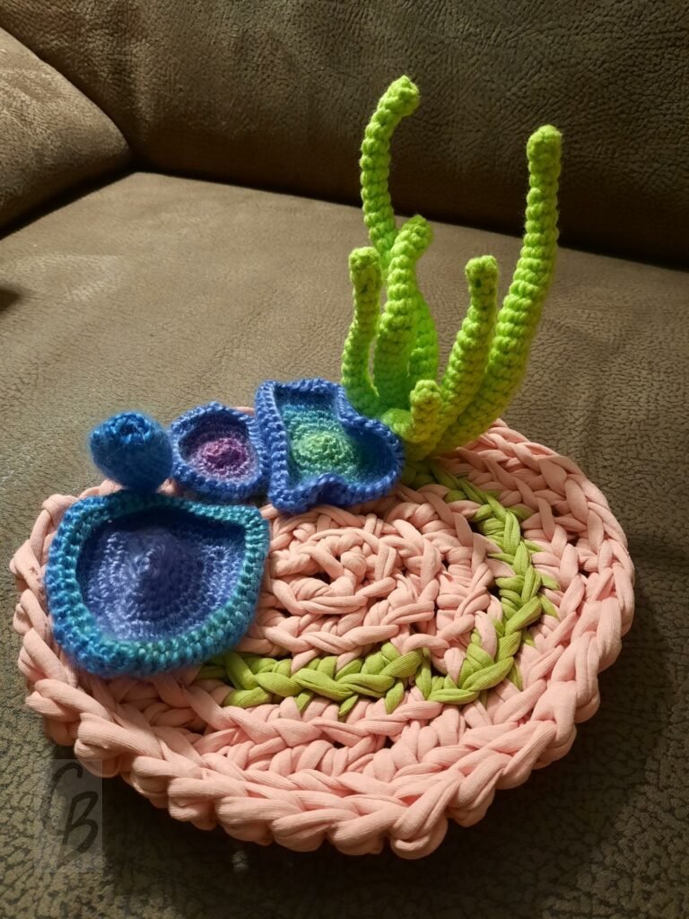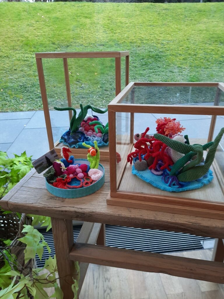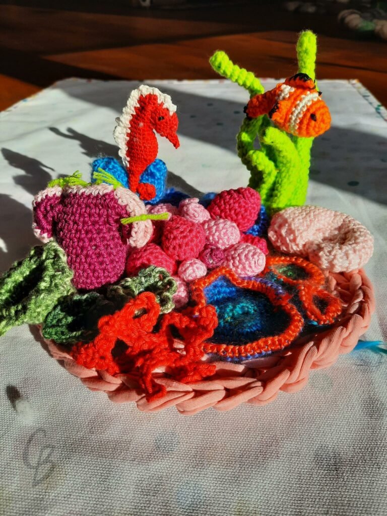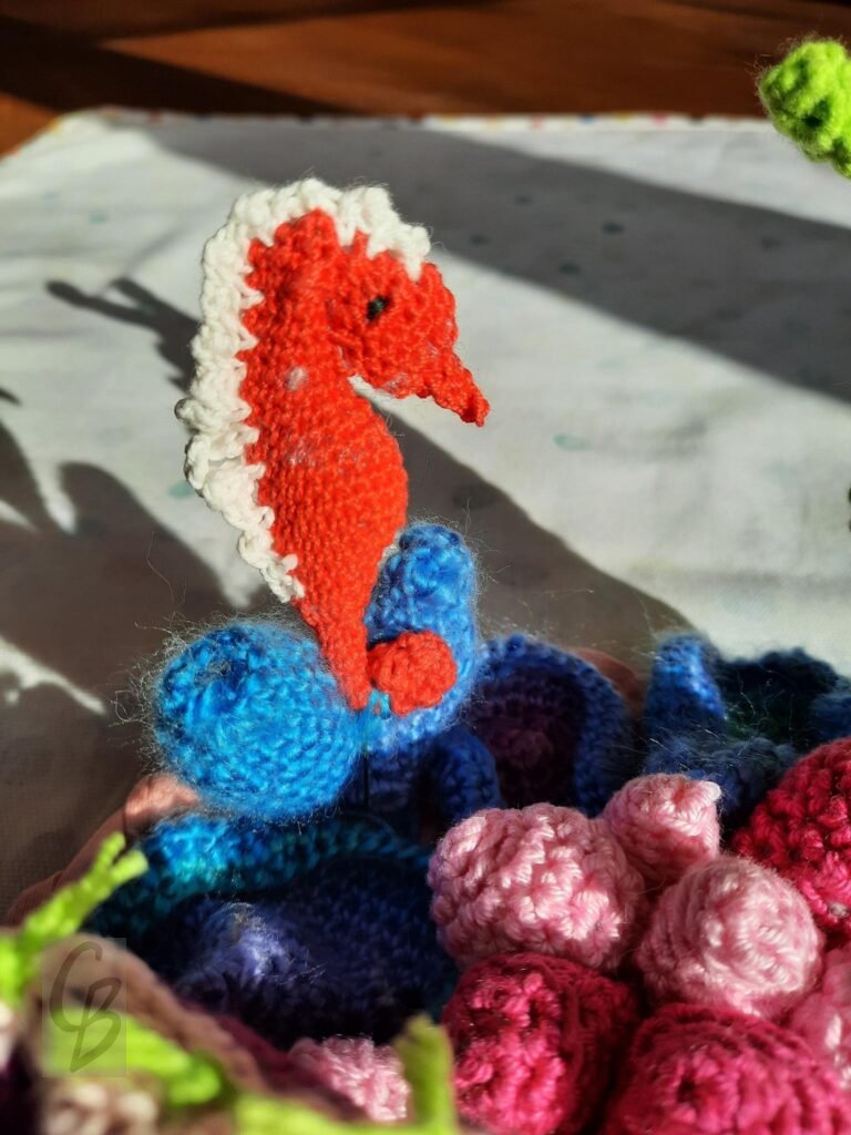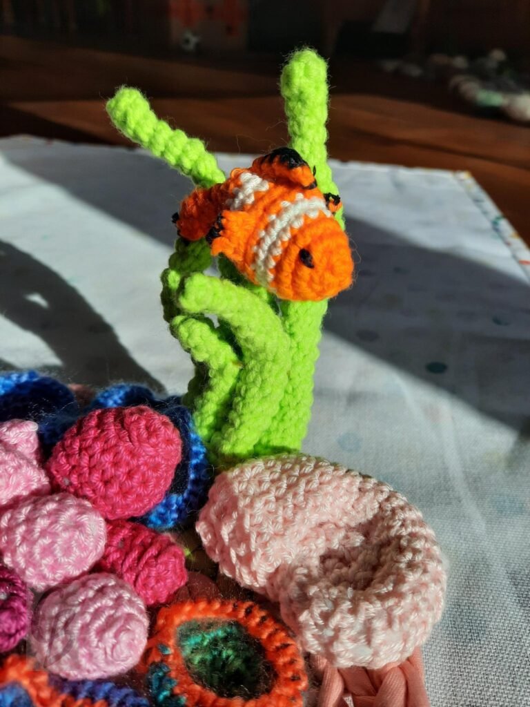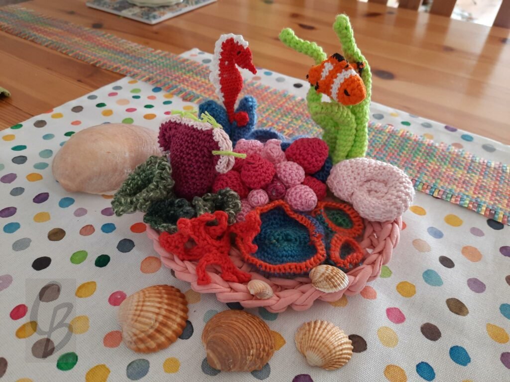 meine kleine Unterwasserwelt wächst… Korallen, Meergras, Posthornschnecke, Clownfisch und Seepferdchen frei erfunden einfach loshäkeln 🙂