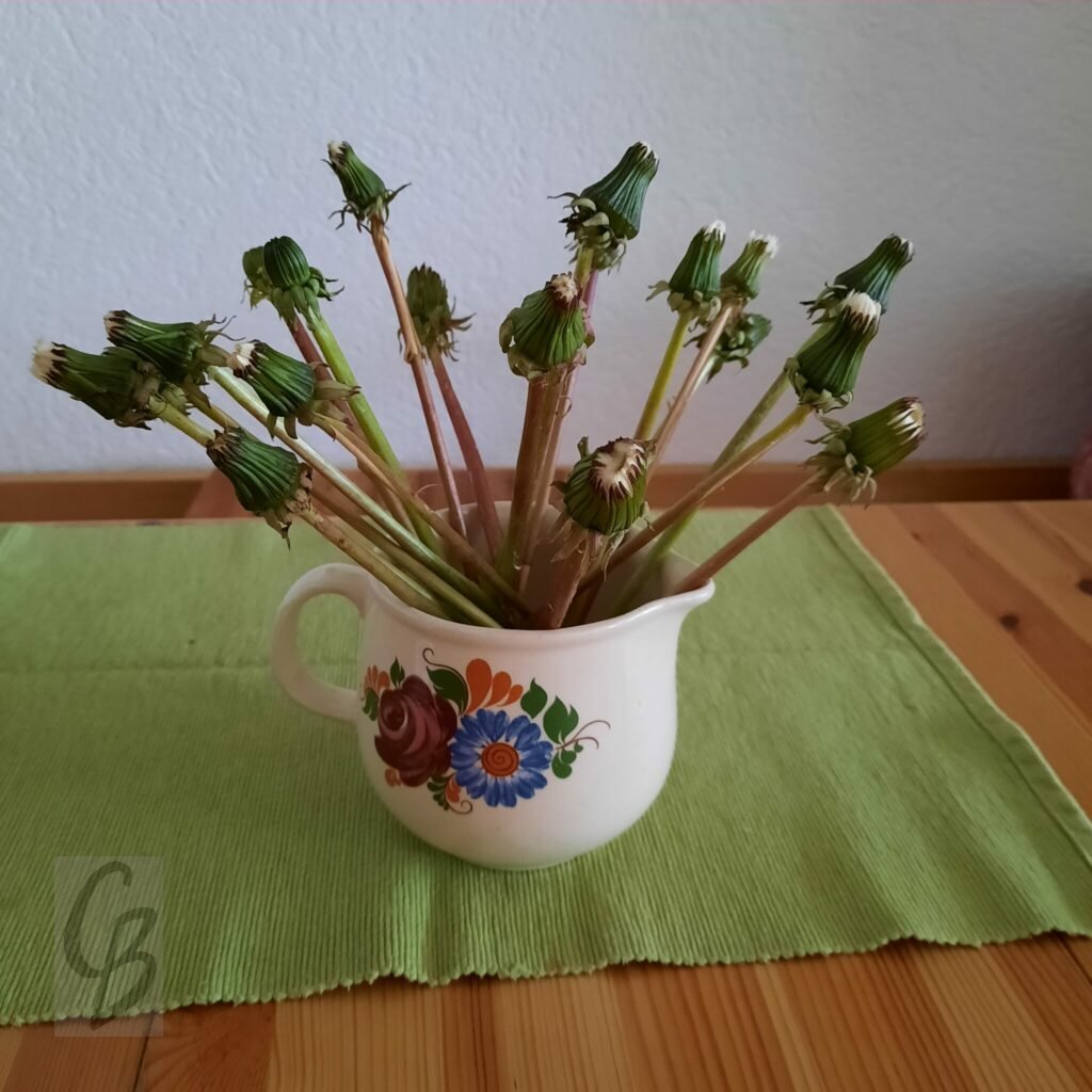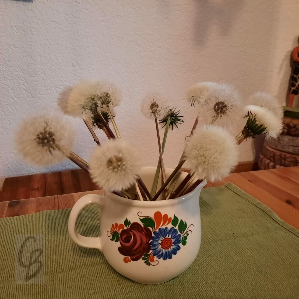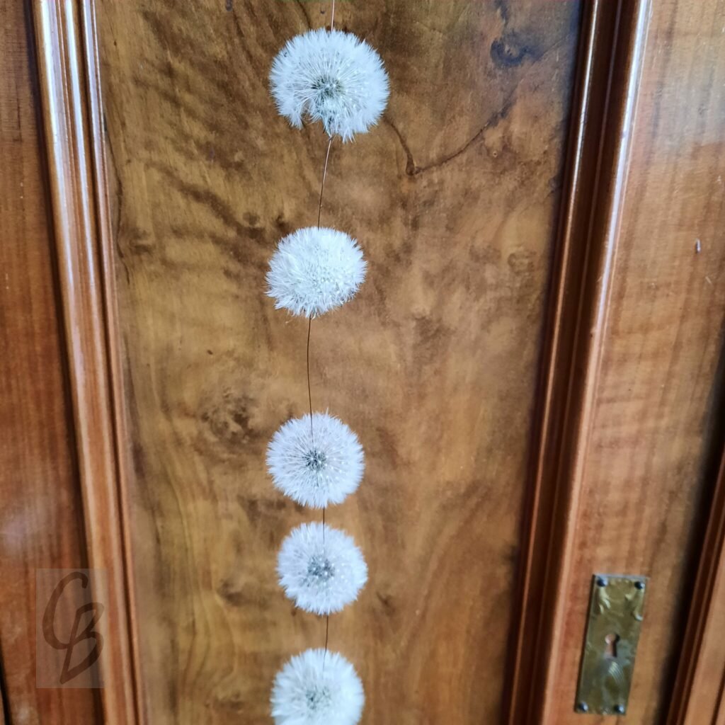 den verblühten Löwenzahn auffädeln oder mit einem Holzstäbchen aufspießen und warten….wie durch ein Wunder öffnen sich über Nacht die Schirmchen der Pusteblume. Immer wieder schön anzusehn 🙂
