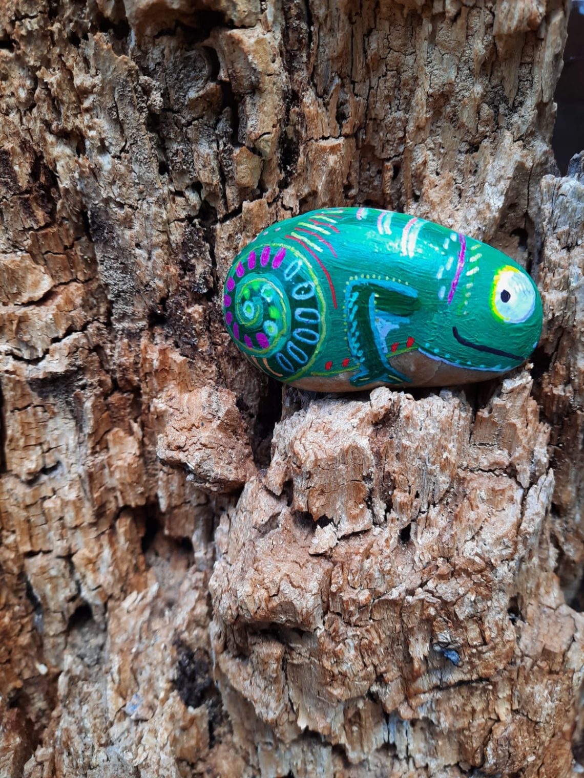 Verstecktes Posten in der Natur rund um Kleinostheim geht ganz einfach. Kleine, handliche Steine bemale ich mit verschiedenen Motiven, zur Zeit sind es Chamäleons, auf der Rückseite steht meine web-Adresse. Beim Spazieren gehen mit meinem Hund verstecke ich die Steine an schönen Stellen im Wald. Geht man nun aufmerksam am Weg entlang findet ihr in Baumspalten, auf Moospolstern oder Wurzeln die kleinen “ Posts „. Wird der Finder dann neugierig, schaut er auf meiner Webseite vorbei und kann sich an noch mehr schönen Dingen erfreuen. Viel Spaß beim Entdecken !